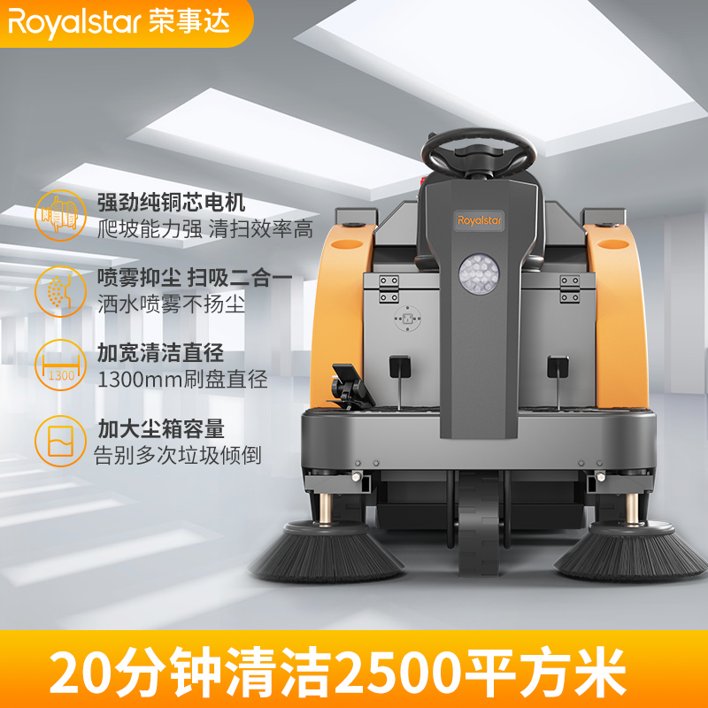 榮事達RS-DS120駕駛式掃地車,持久續航“鋰”所當然,鋰電款可使用長達五年以上,循環充放電數達1500-2000...